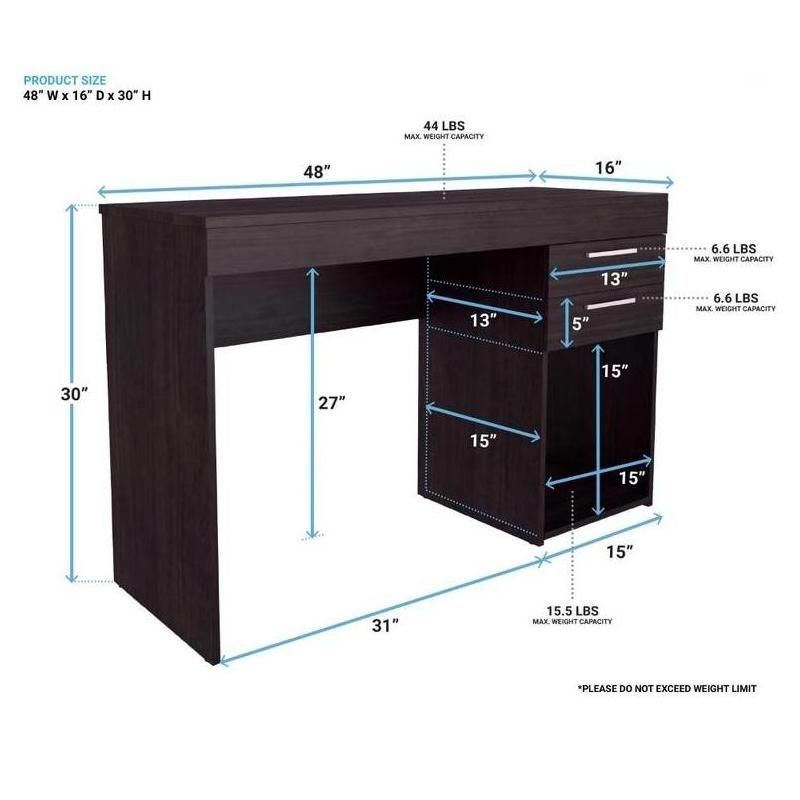 Crafted from durable particleboard with a painted surface, this desk promises longevity and resilience against daily wear and tear. Its sturdy construction is designed to support your work essentials efficiently, with a weight limit of 44 lbs for the tabletop and 6.6 lbs for each drawer.