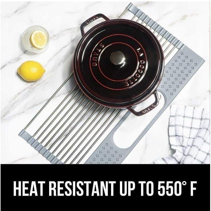 Whether you’re air-drying dishes, rinsing fruits and vegetables, or needing an extra cooling rack, this drying rack is your go-to kitchen aid. Its heat resistance makes it ideal for protecting countertops from hot pots and pans.
